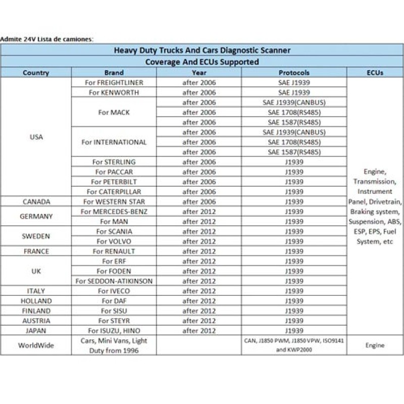 Mini furgonetas, carga ligera, carga pesada desde el año 1996 en adelante, CATERPILLAR, INTERNATIONAL, MACK, VOLVO, RENAULT, IVECO, DAF, SISU, STEYR, ISUZU, HINO, FREIGHTLINER, KENWORTH, STERLING, PACCAR, PETERBILT, WESTERN STAR, MERCEDES-BENZ, MAN, SCANIA, ERF, FODEN, SEDDON-ATIKINSON.