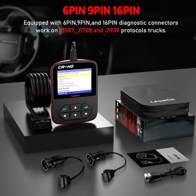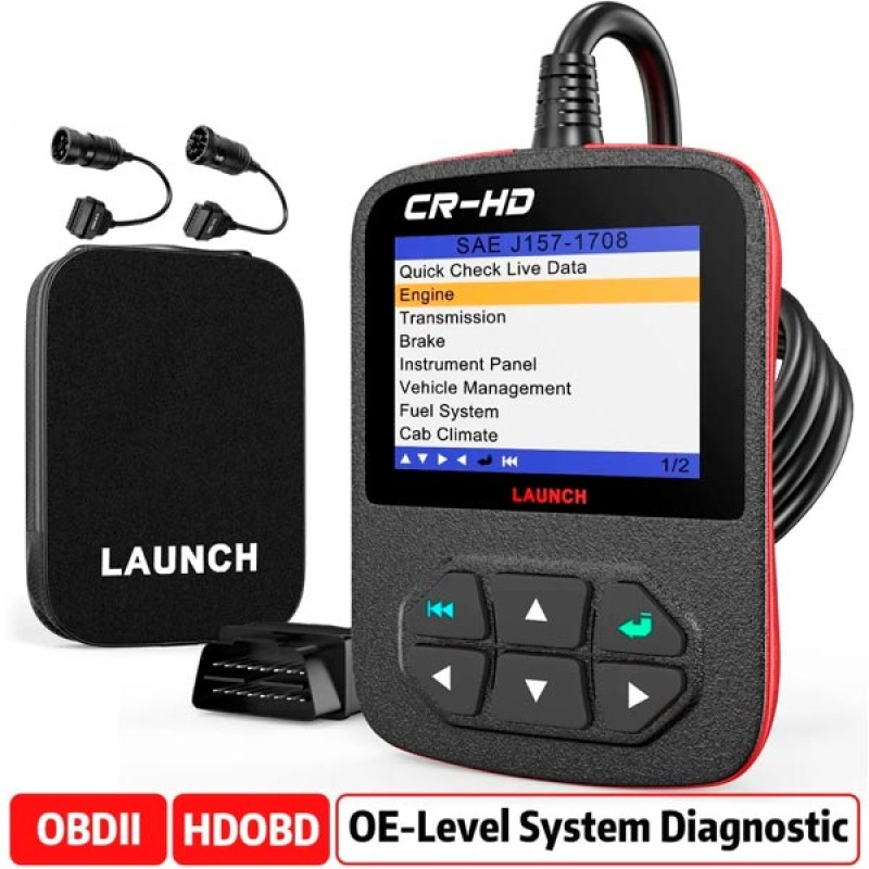 El escáner de diagnóstico Launch CR-HD HEAVY DUTY (para camiones y vehículos pesados) de la marca Launch es compatible con todos los protocolos estándar (J1587, J1939 y J1708), y también 10 modos de pruebas OBD para un diagnóstico completo.