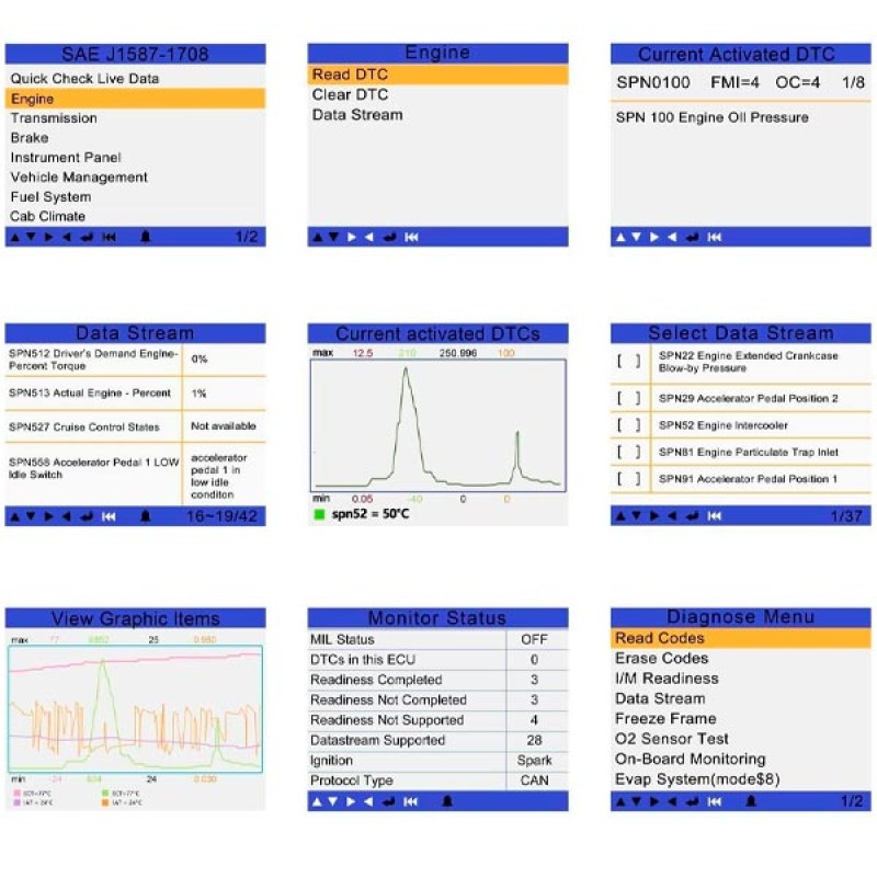 - Diagnóstica camiones y vehículos pesados de acuerdo con los protocolos estándar (J1587, J1939 y J1708)